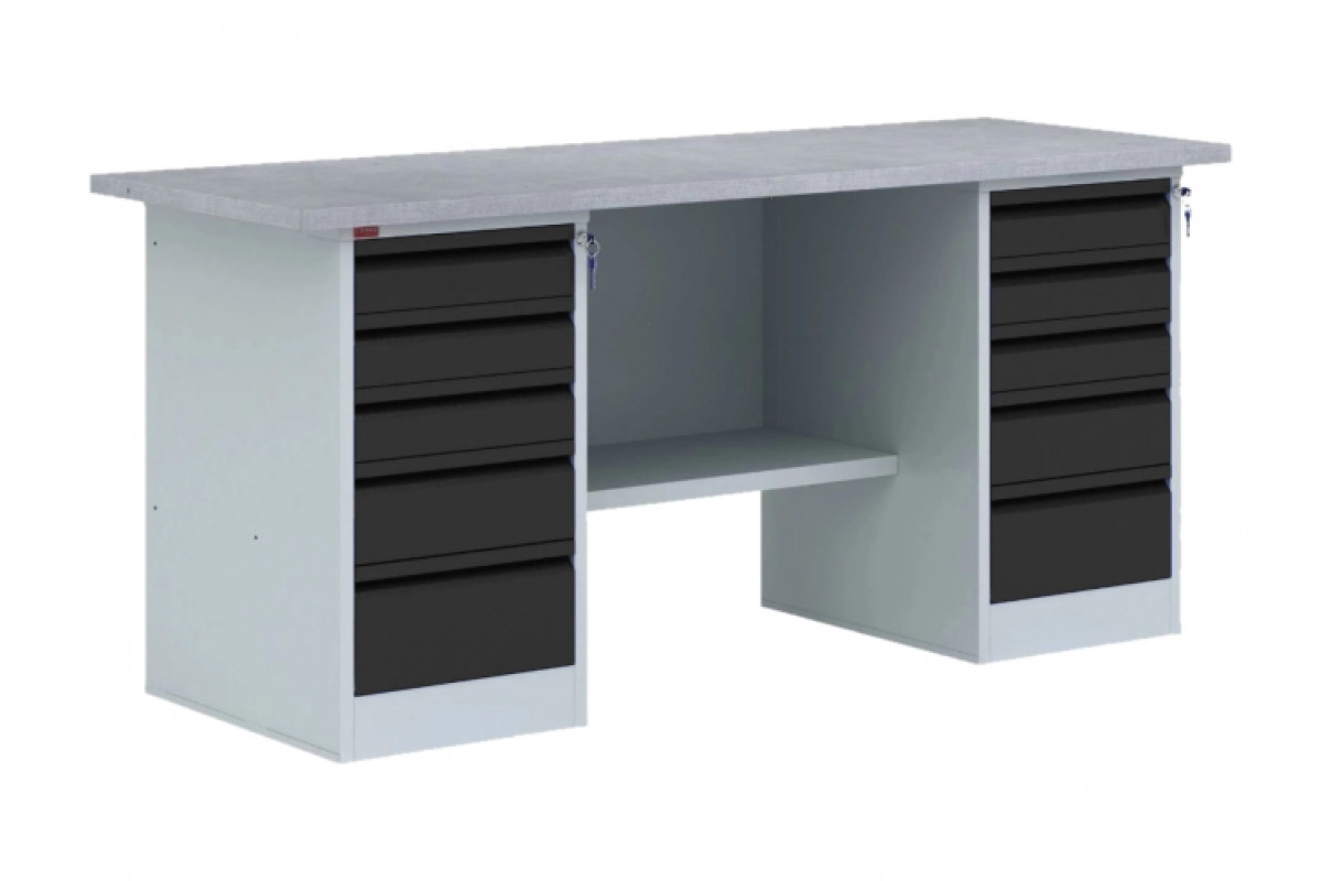 Верстак состоит из отдельных модулей: столешница из МДФ, покрытая оцинкованным листовым металлом; стенка задняя металлическая; две тумбы с 5-ю выдвижными ящиками (нагрузка 30 кг) запирающимися на центральный замок; полка верстачная (нагрузка 40 кг). Ве