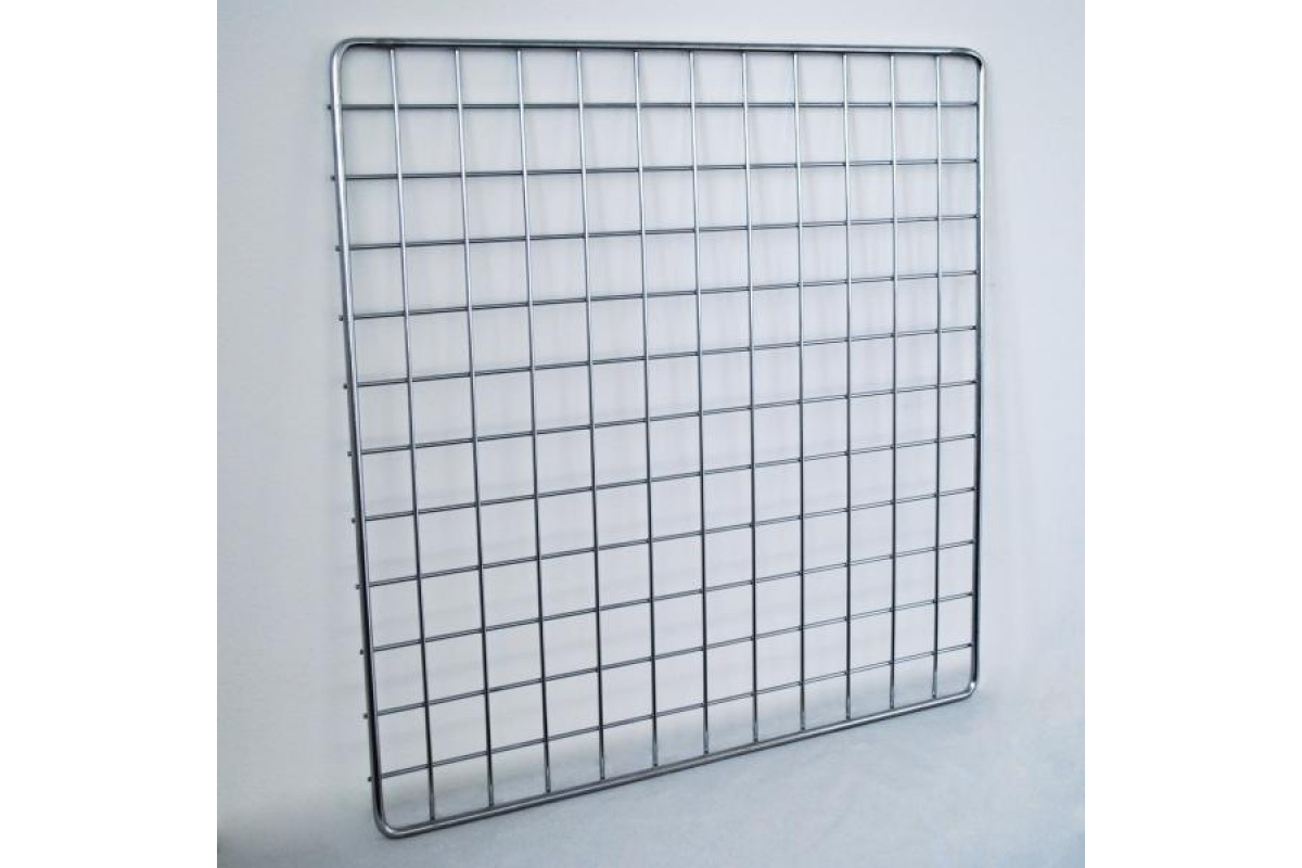 Панель-сетка, ячейка 50*50 мм, покрытие хром. Наружная окантовка – проволока диаметром 9 мм, внутренняя проволока диаметром 4 мм. Панели-сетки это универсальное решение позволяющее создавать любые задуманные экспозиции. Данным торговым оборудование мож
