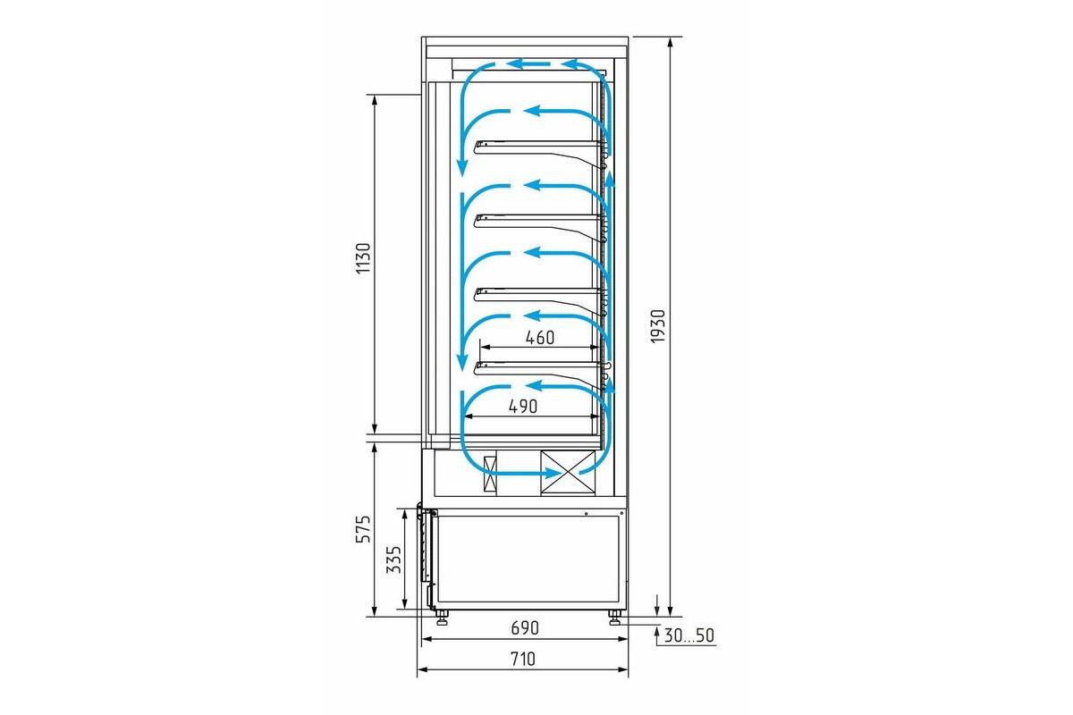 На задней стальной панели рабочей камеры предусмотрены отверстия для установки полок с продуктами на нужной высоте. Динамическое охлаждение содержимого камеры обеспечивают размещенный в нижней части корпуса компрессорный агрегат и встроенный вентилятор. Управление горкой осуществляется с нижней передней панели, где находятся управляющие клавиши и цифровой дисплей.