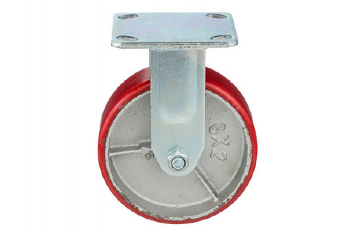 Колесо 1041-152, диаметр 152 мм, чугун / полиуретан, неповоротное. Грузоподъемность 360 кг. Колесо полиуретановое, центр из литого чугуна. В оси колеса расположен игольчатый подшипник. Стойкий к боковым ударам неповоротный кронштейн. Наличие масленки позволяет периодически обслуживать подшипник оси колеса. Крепление площадка под 4 болта. Колеса полиуретановые с чугунным сердечником широко применяются на бетонных полах преимущественно внутри помещений. Широко используются на тележках, строительных лесах и другом оборудовании, где требуется высокая грузоподъемность. При длительном нахождении под большой нагрузкой не деформируются. Возможно использование вне помещении на твердых покрытиях. Температура эксплуатации от -20 до +50 С.