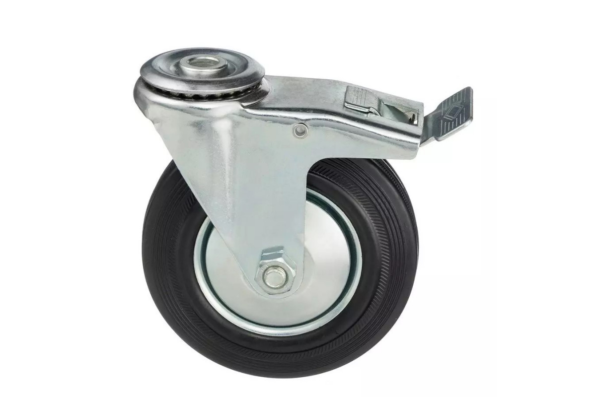 Колесо поворотное с тормозом с отверстием под болт 12мм, 4005-125, диаметр 125 мм, грузоподъемность 100 кг. Колеса из черной литой резины, центр из двух гальванизированных дисков из штампованной стали.