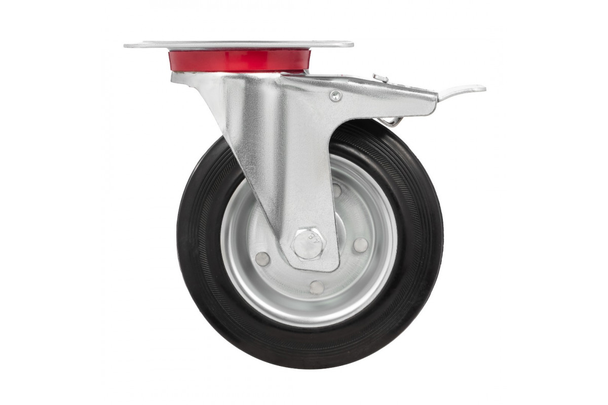Колесо поворотное с тормозом 4003-160, диаметр 16 0мм, грузоподъемность 145 кг. Колеса из черной литой резины, центр из двух гальванизированных дисков из штампованной стали.