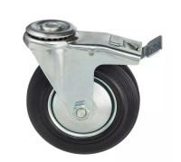 Колесо поворотное с тормозом 4003-200, диаметр 200 мм, грузоподъемность 185 кг. Колеса из черной литой резины, центр из двух гальванизированных дисков из штампованной стали. Роликовый (игольчатый) подшипник расположен в углублении, выдавленном под прессом, и содержит цилиндрические ролики подшипника. Кронштейн изготовлен прессованием из листовой стали. В поворотном узле двухрядный шарикоподшипник. Кронштейн оснащен тормозом, блокирующим вращение колеса и вилки, относительно площадки крепления. Возможно применение на относительно грубых полах складов, заводов, производственных и строительных площадках. Данные колеса можно использовать на неровных поверхностях, во влажной окружающей среде и использовании вне помещения, не рекомендуется применять в среде с органическими растворителями, хлорированными веществами, гидрокарбонатами и минеральными маслами. Температура эксплуатации от -20 до +70С.
