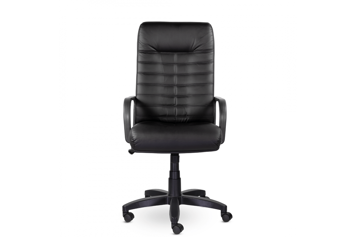 Массивное кресло руководителя с горизонтальными прострочками по ширине всей спинки и углублением. Возможность синхронно отклонять спинку и фиксировать сидение в рабочем положении.