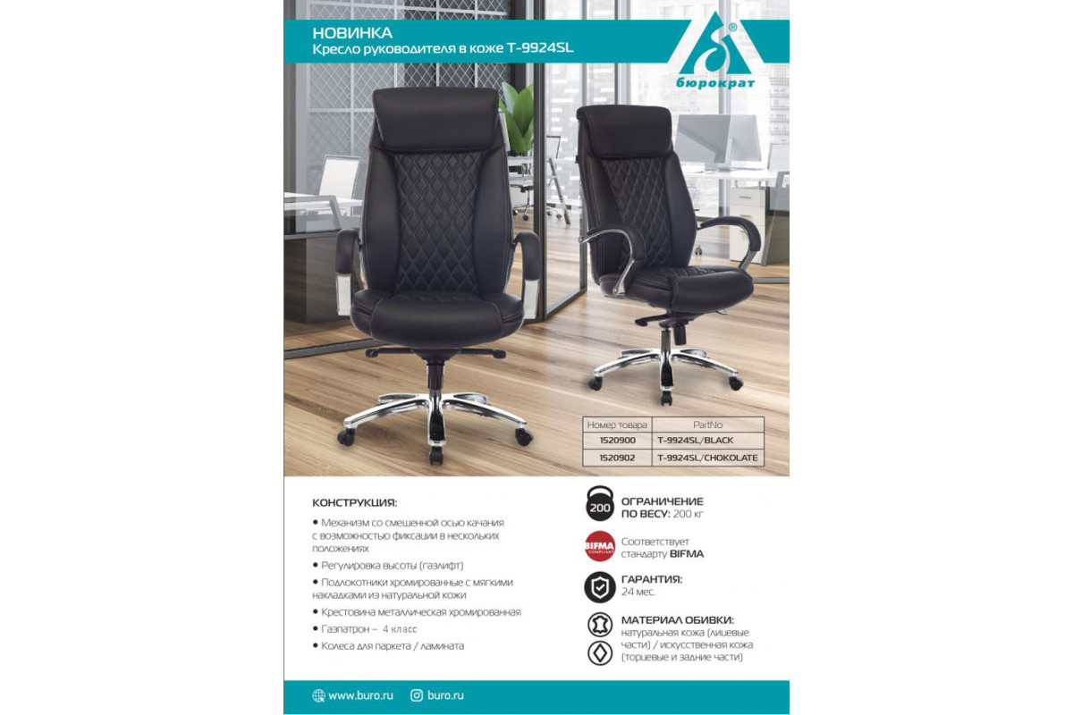 Кресло руководителя Бюрократ T-9924SL черный кожа крестовина металл хром