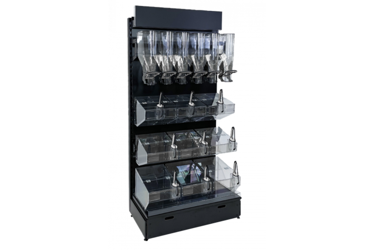 Металлический стеллаж с дозаторами, ячейками из оргстекла и ячейками вместо базовой полки
