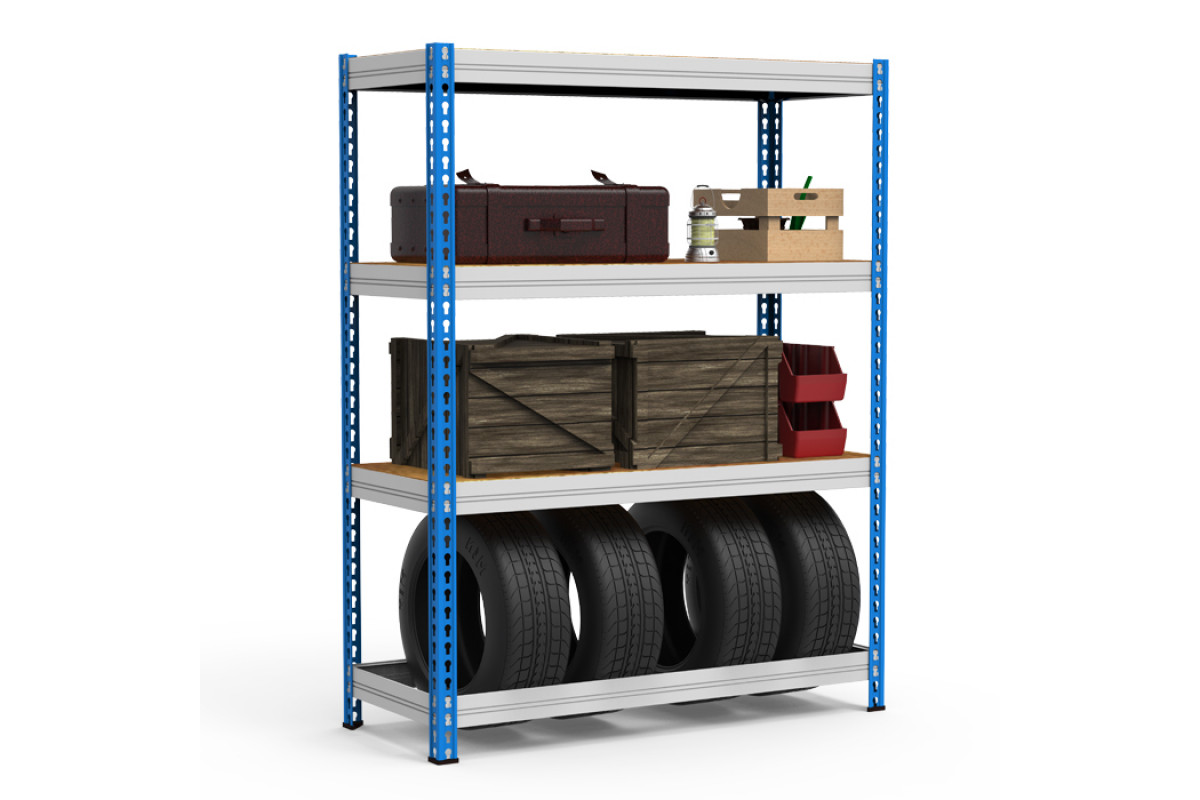 - Стеллажи полочные, сборно-разборные. Особенности конструктивного исполнения стеллажа позволяют производить сборку без дополнительных крепежных элементов. Профиль балки МКФ позволяет использовать стеллаж в двух вариантах: одна сторона предназначена для настила, другая – для хранения автомобильных колес. В первом варианте каждая полка (ярус) состоит из продольных и поперечных) балок, на которых размещается усиленная фанера, во втором варианте – только продольные и поперечные балки. Балки стеллажа крепятся к стойкам при помощи двух замков с зацепами. Стеллажи с представленными размерами позволяют хранить колеса радиусом от 13” и выше.