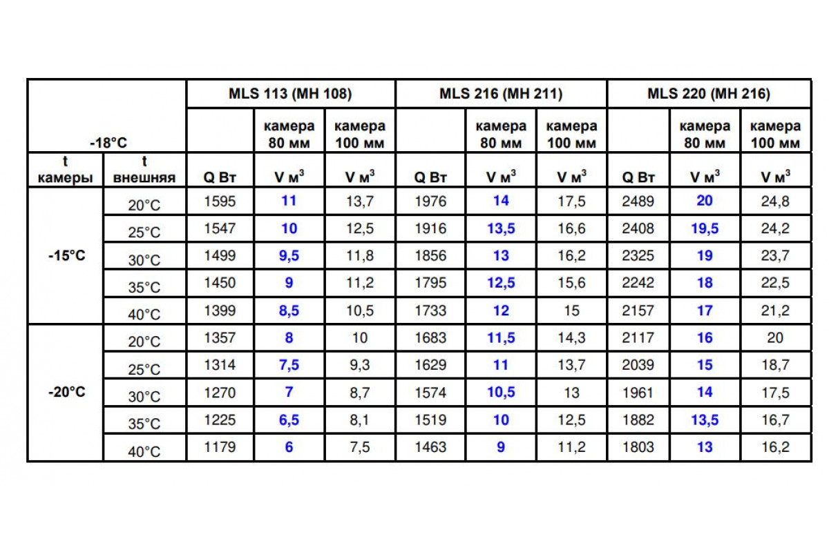 Холодопроизводительность и объём камеры указаны при условии внешней температуры +20°c, температуры внутри камеры -15°c, толщина стенок камеры 100 мм