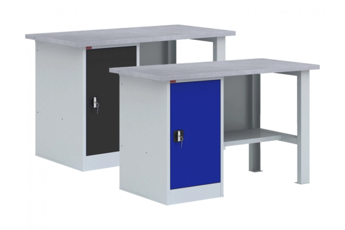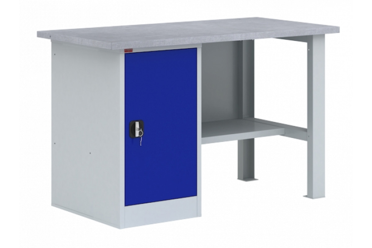 Верстак ВП-2 состоит: столешница из МДФ, покрытая оцинкованным листовым металлом; стенка задняя металлическая; металлическая верстачная опора; тумба с 2-мя съемными полками (нагрузка до 30 кг); дверь запирающаяся замком; полка верстачная (нагрузка до 4