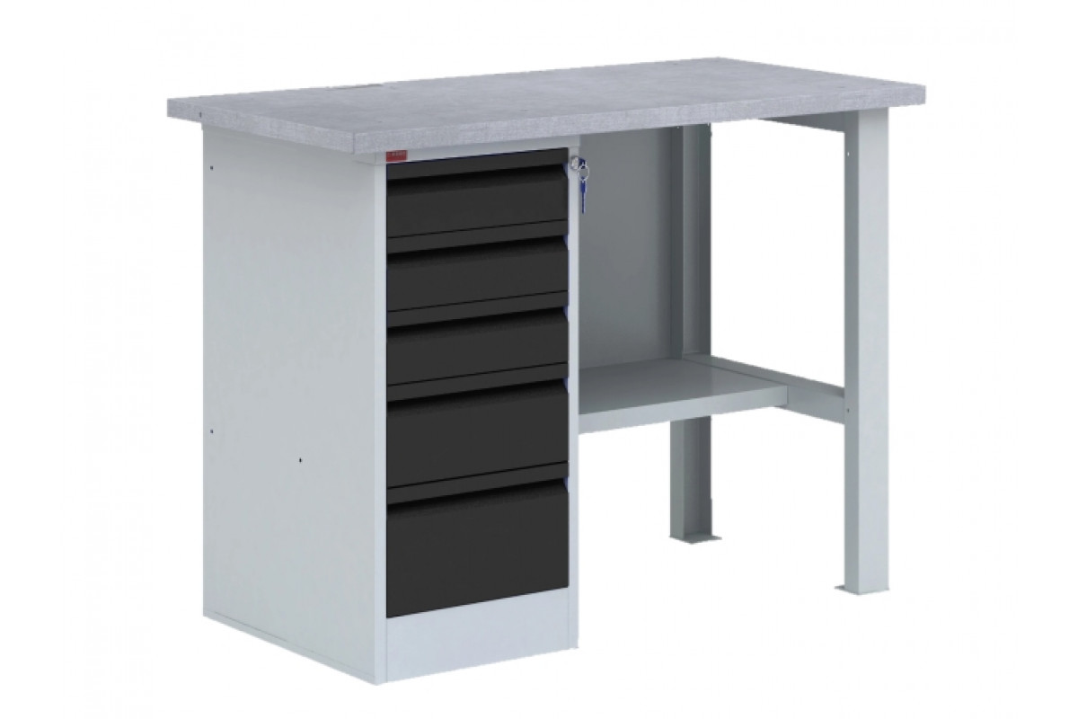 Верстак ВП-3 состоит: столешница из МДФ, покрытая оцинкованным листовым металлом; стенка задняя металлическая; металлическая верстачная опора; тумба с 5-ю выдвижными ящиками (нагрузка до 30 кг) запирающимися на центральный замок; полка верстачная (нагр