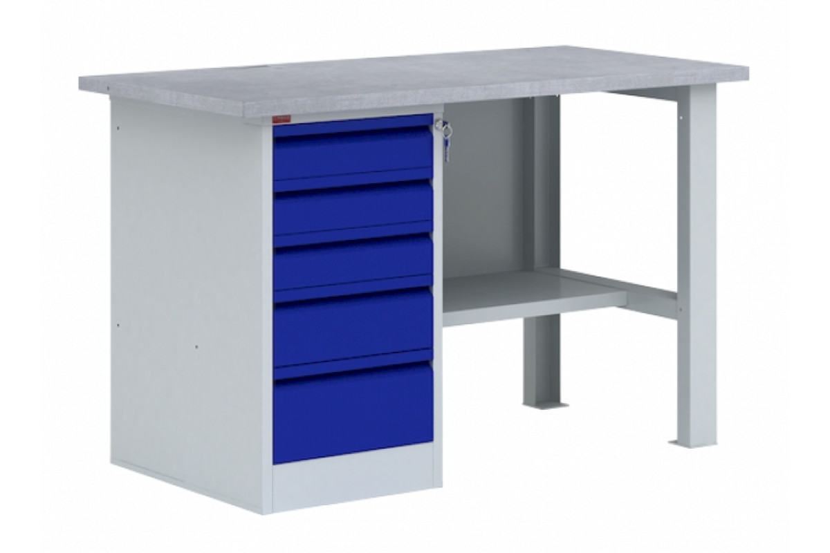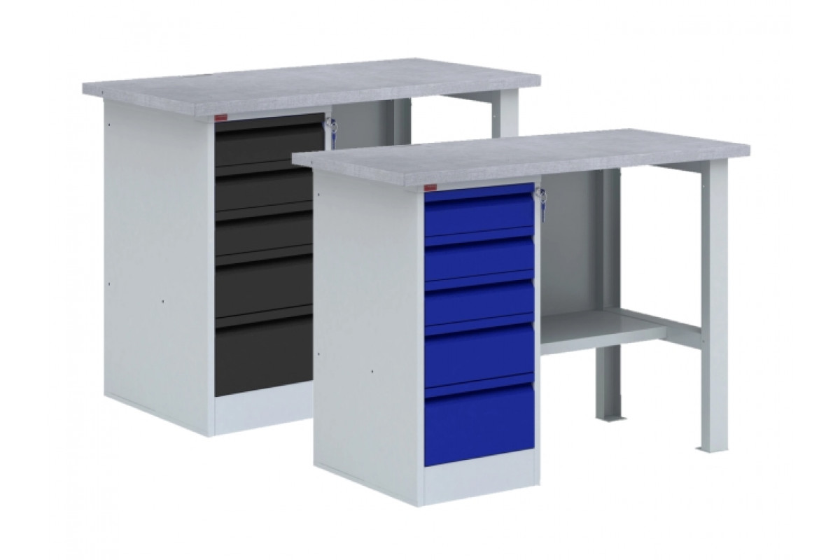 Верстак ВП-3 состоит: столешница из МДФ, покрытая оцинкованным листовым металлом; стенка задняя металлическая; металлическая верстачная опора; тумба с 5-ю выдвижными ящиками на телескопических направляющих (нагрузка до 30 кг)