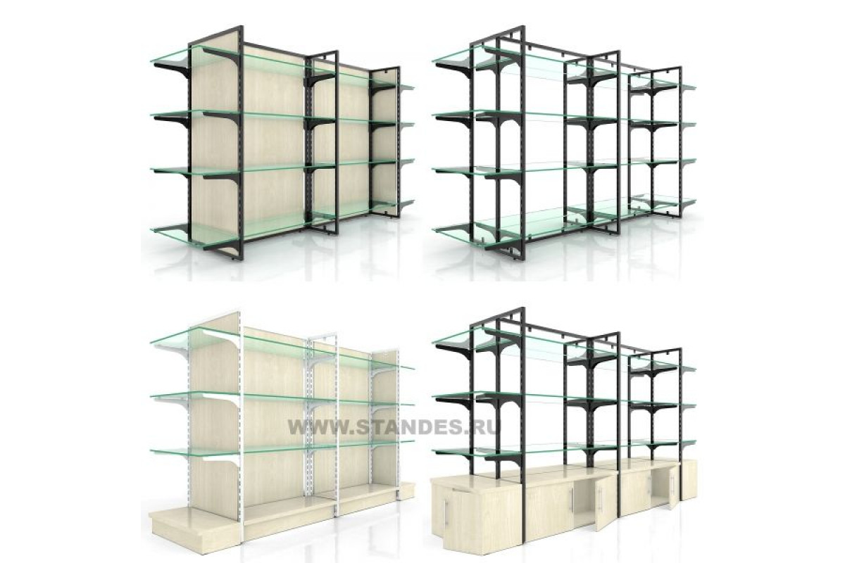Дополнительно комплектуется - задними стенками ДСП, стеклянными полками, подиумом-полкой, вешалом под одежду, опорой под аксессуары, кронштейны, крючки.