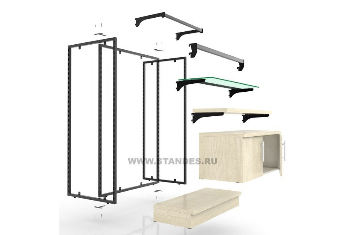 Дополнительно комплектуется - стеклянными полками, нижний подиум, накопителем с дверками, вешалом под одежду, опорой под аксессуары, кронштейны, крючки.