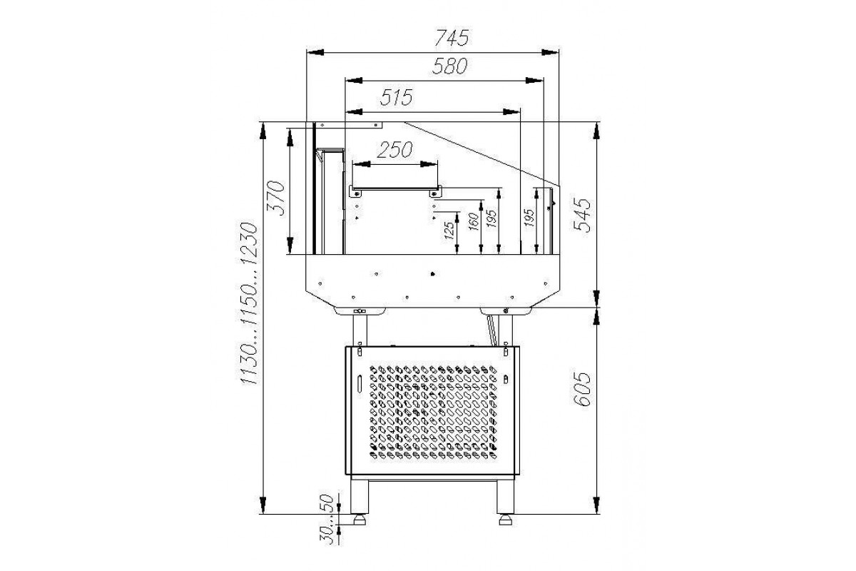 - 1 полка с возможностью установки на разной высоте. Глубина выкладки – 250 мм;
