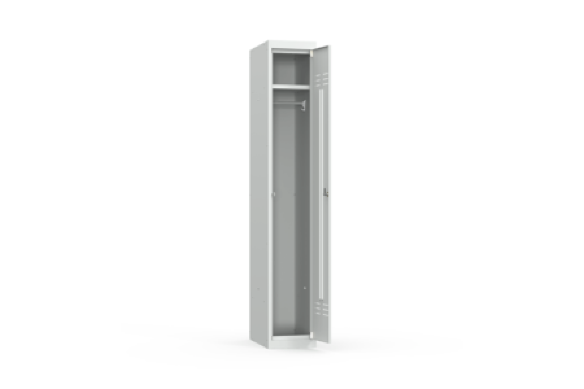 Односекционный металлический шкаф для одежды имеет полную внутреннюю комплектацию: полку для головных уборов, пластиковые перекладины для вешалок и два крючка для одежды. проушина для навесных замков. Размер секций обеспечивает комфортное размещение верхней одежды, в том числе зимней. Конструкция предусматривает возможность установки дополнительной полки для обуви.