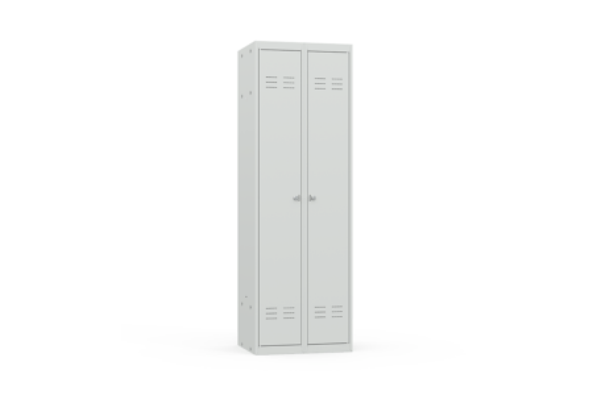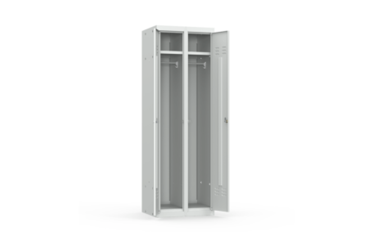 Шкаф имеет две секции, каждая из которых оснащается полкой для головных уборов, пластиковыми перекладиной для вешалок и двумя крючками для одежды, проушиной для навесных замков. Размер секций обеспечивает комфортное размещение верхней одежды, в том числе зимней. Конструкция предусматривает возможность установки дополнительной полки для обуви.