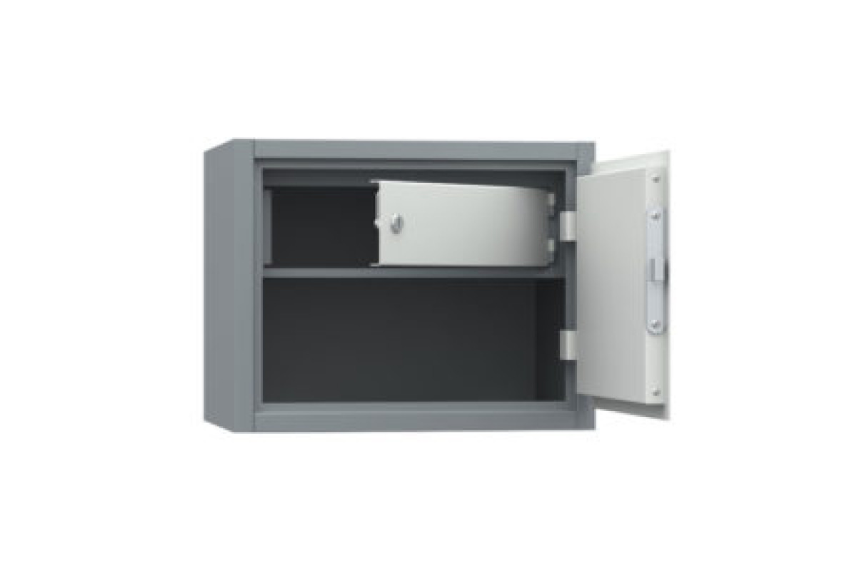 Дверь шкафа имеет усиленную конструкцию. Безопасность содержимого обеспечивают замок сувальдного типа (3 ключа в комплекте) и почтовый ключевой замок «ЦЕРЕРА» (2 ключа в комплекте).