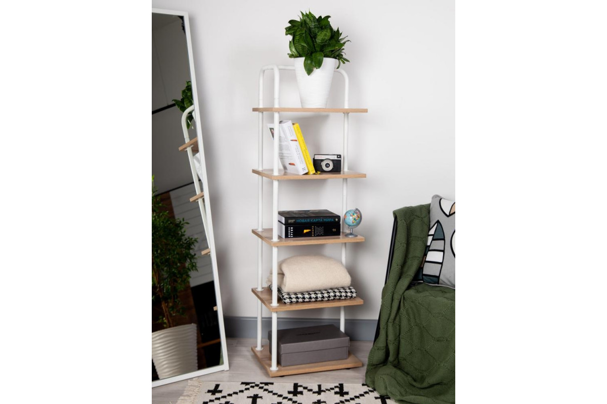 Еще один стильный предмет интерьера серии Отрада – стеллаж. Пять полок из высококачественного ЛДСП лучшего европейского производителя Egger, стальная труба диаметром 20мм с порошковым покрытием модных оттенков, надежные крепления – делают конструкцию п