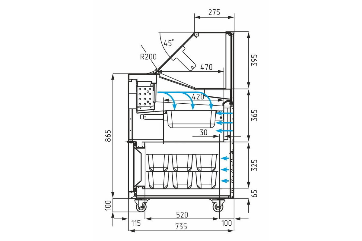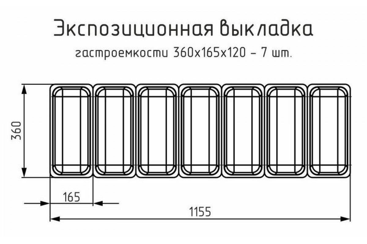 - Полезный объем экспозиционной выкладки 35 л. Вместимость гастроёмкостей 7 шт;