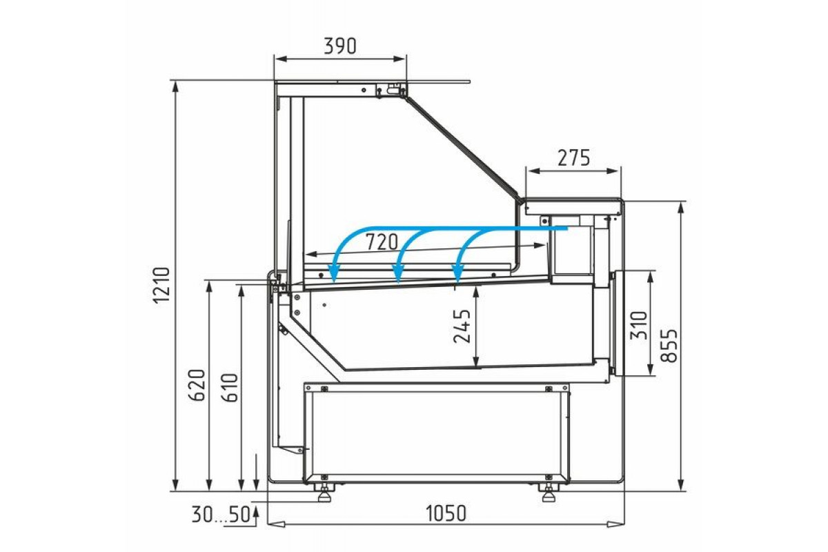 Отдельностоящая витрина приобретается только вместе с боковинами. При заказе нескольких витрин с одинаковым температурным режимом для установки в линию достаточно заказать 2 боковины на всю линию.
