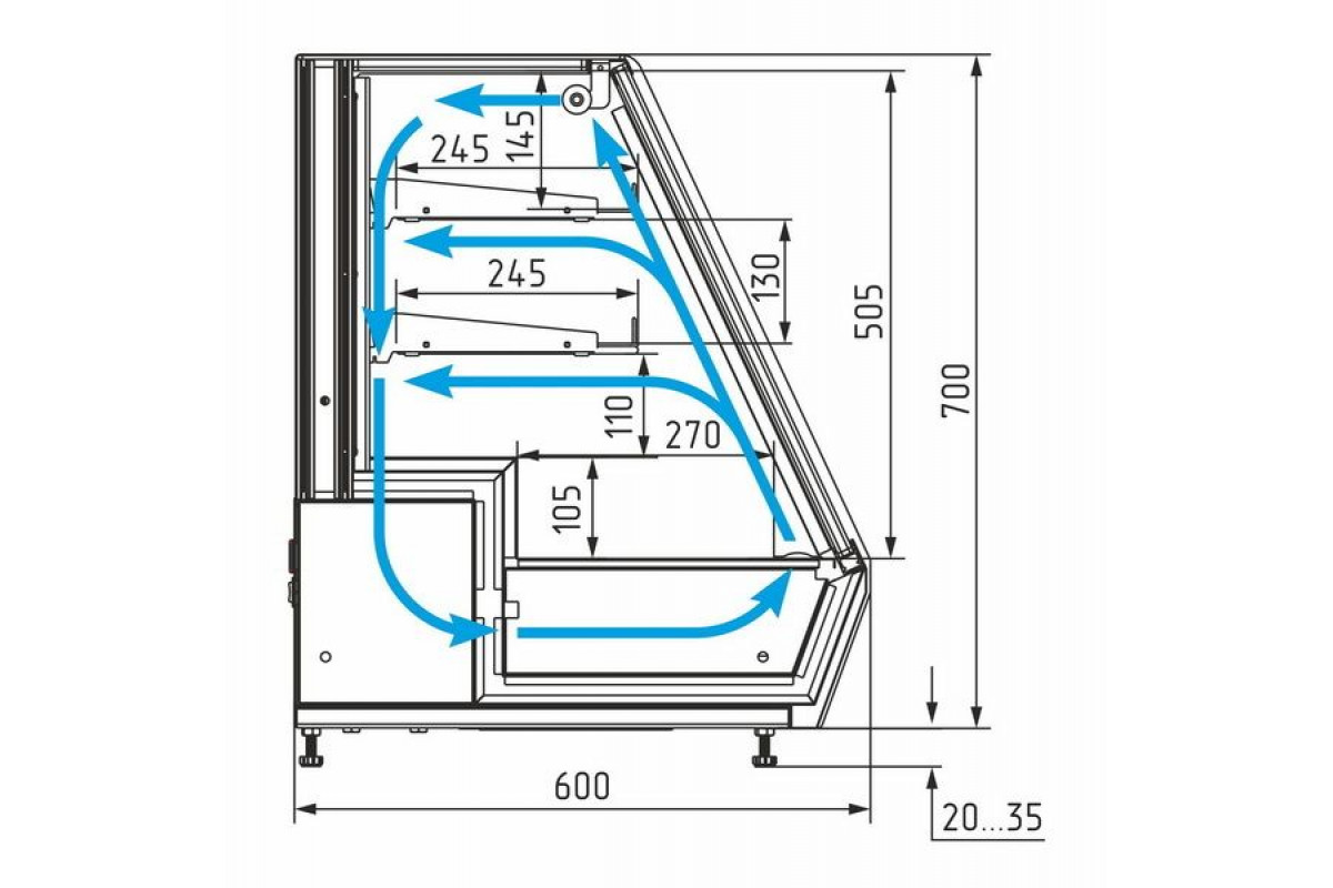 - Полки-решетки глубиной 245 мм с ограничителем, с возможностью установки под углом 5°;