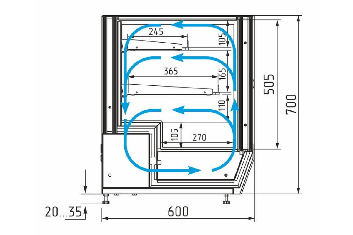 - Глубина выкладки 270 мм + 2 полки: 365 мм и 245 мм;