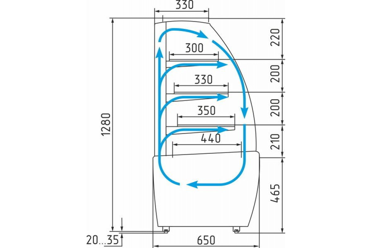 - глубина выкладки 440 мм + 3 полки: 300 мм, 330 мм, 350 мм;