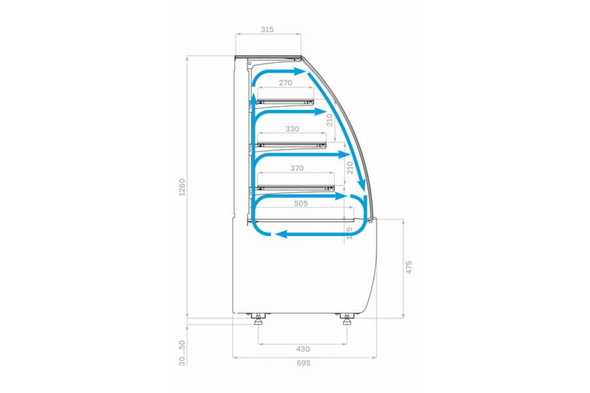 - Глубина выкладки 505 мм+ 3 полки: 370 мм, 330 мм, 270 мм;