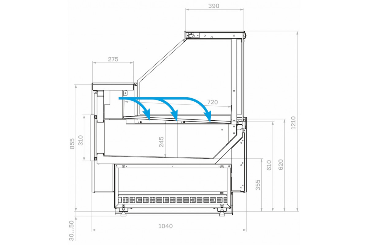 - Экспозиционная поверхность и столешница изготовлены из шлифованной нержавеющей стали;