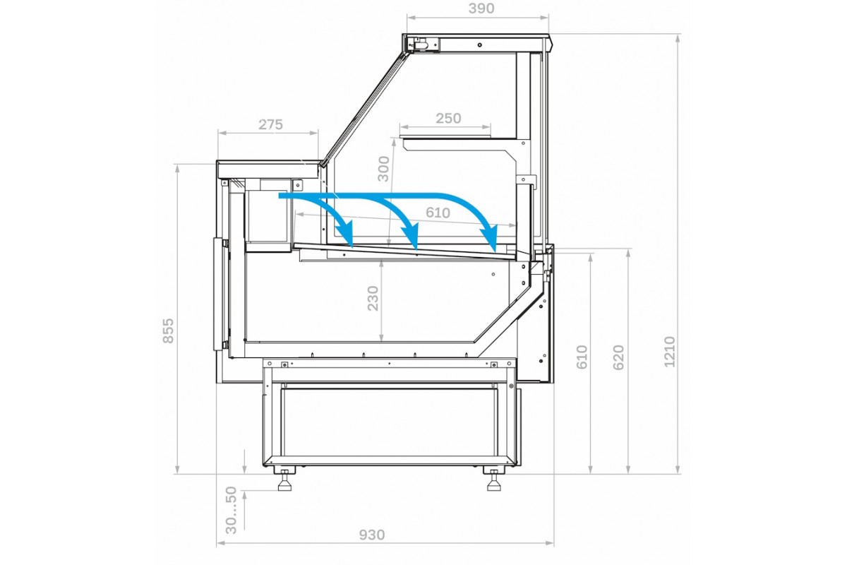 Модель без боковин предназначена для установки нескольких витрин в линию и не может использоваться как отдельностоящая. При заказе нескольких моделей для установки в линию достаточно приобрести две боковины для первой и последней витрины.